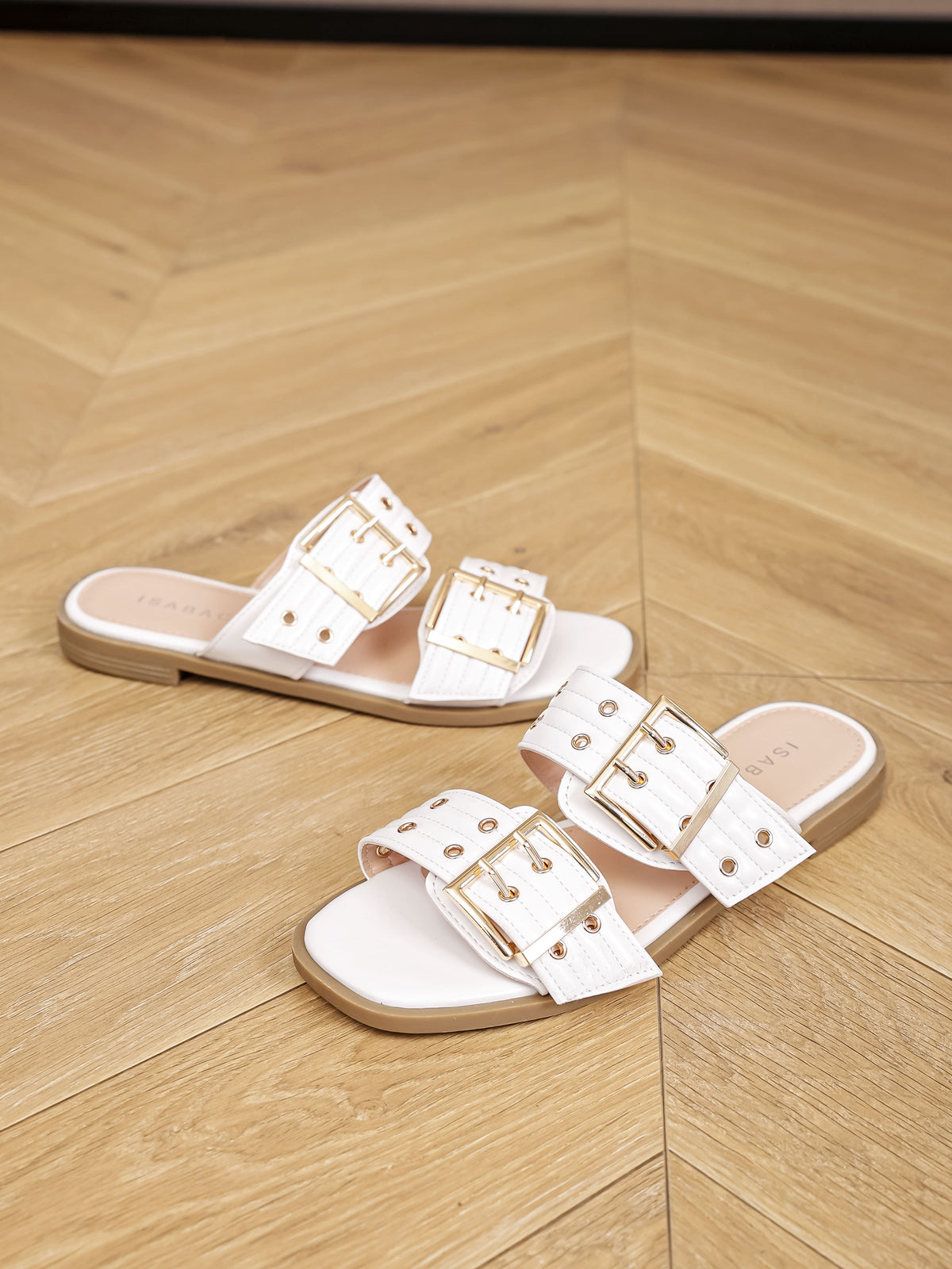 Sandalo con fibbie dorate regolabili, sottile suola piatta.