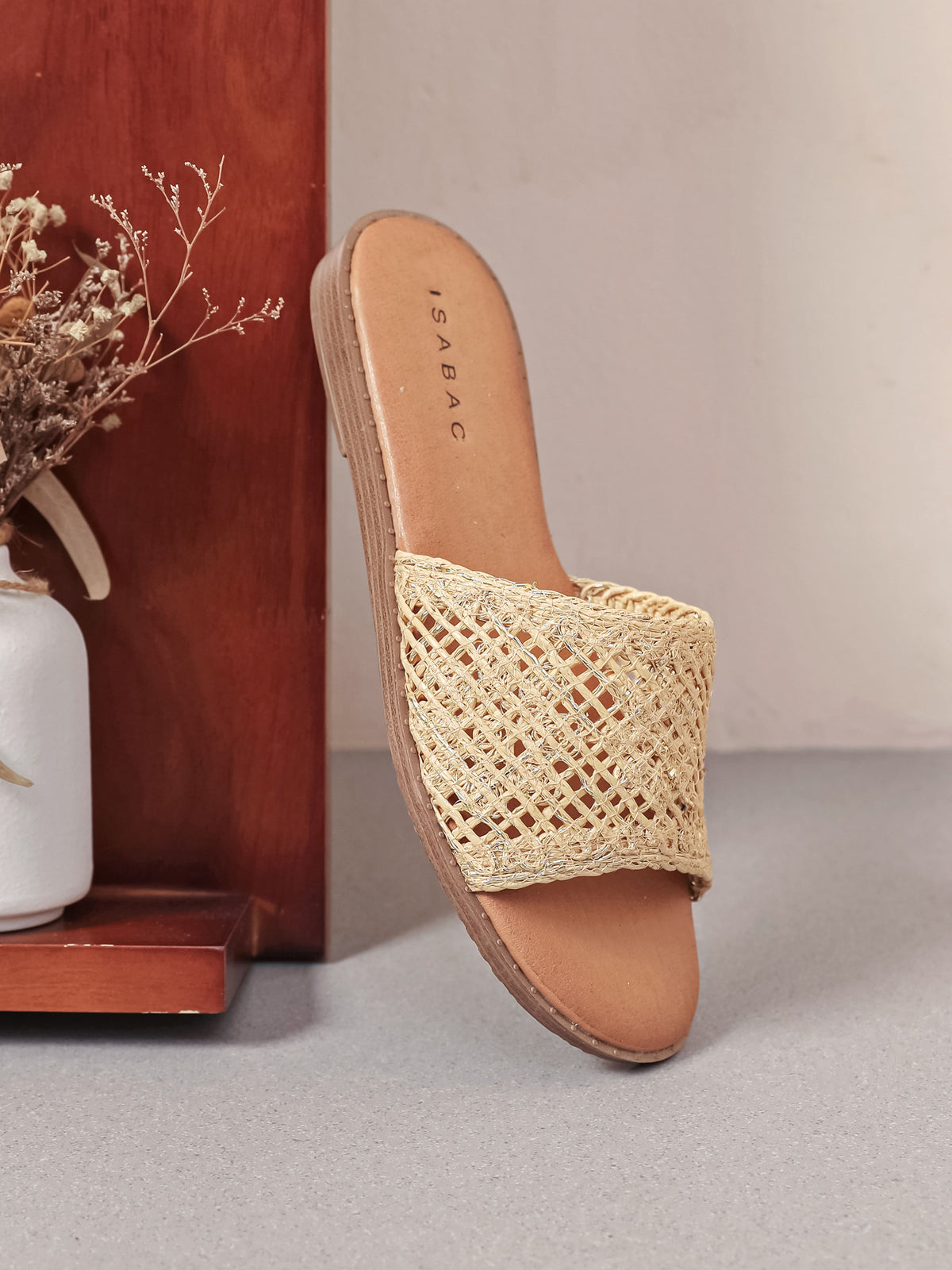 Sandalo intrecciato con filamenti in oro metalizzato.