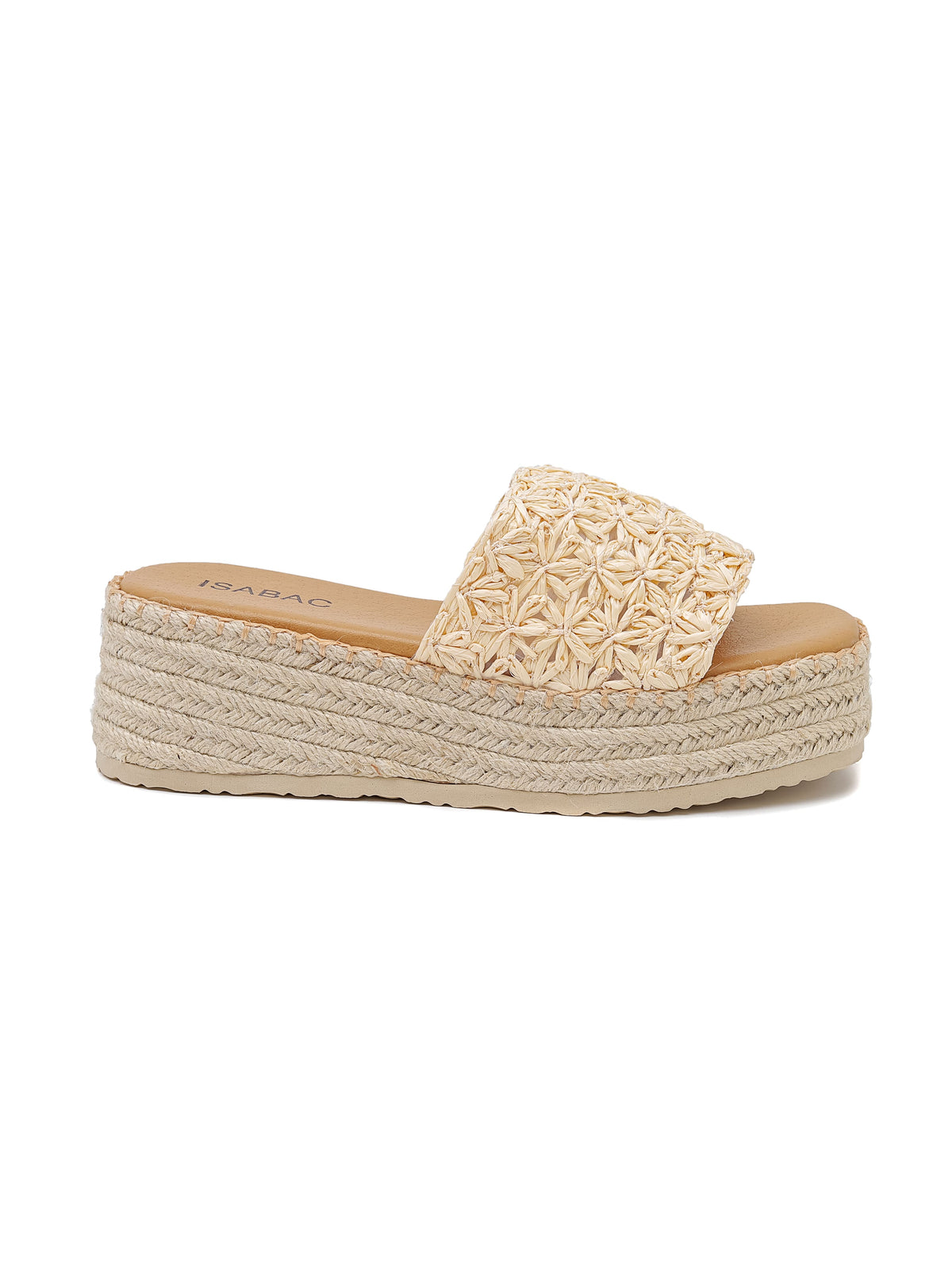 Sandalo ISABAC: tomaia e suola spessa in rafia intrecciato, cinturino testurizzato.