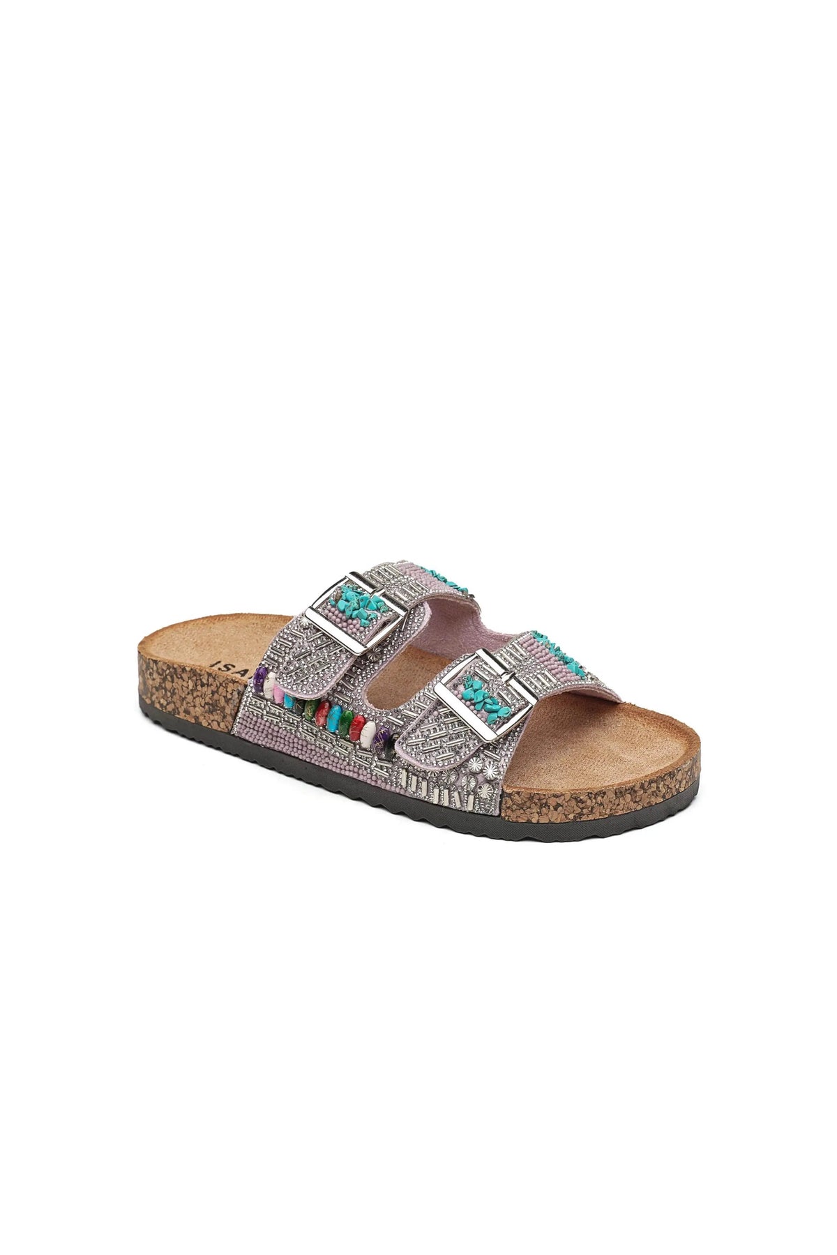 Sandalo ISABAC bianco con due fibbie e elementi vivaci.