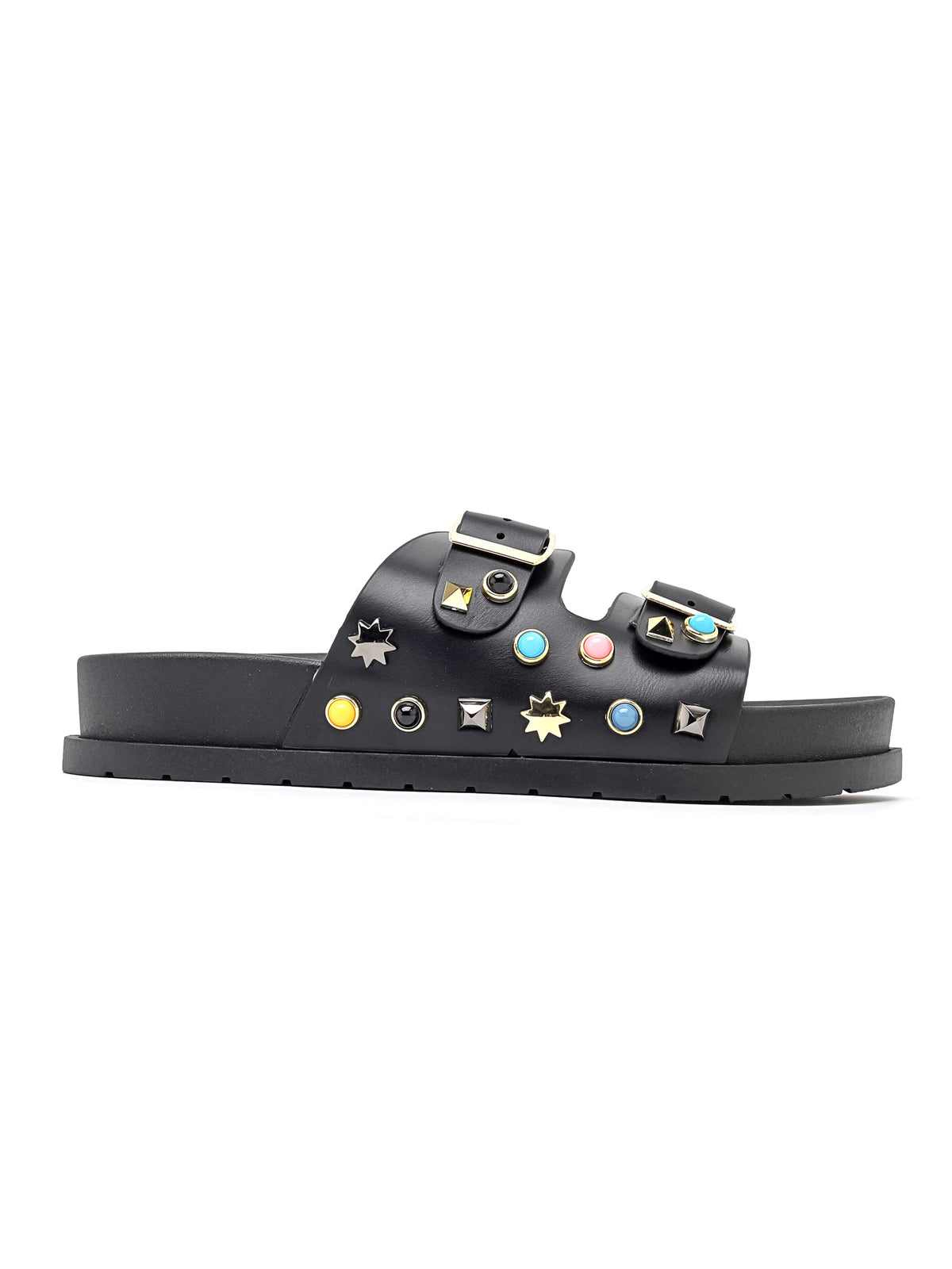 Sandali con accessori da decorazione con stelle colorate e borchie.