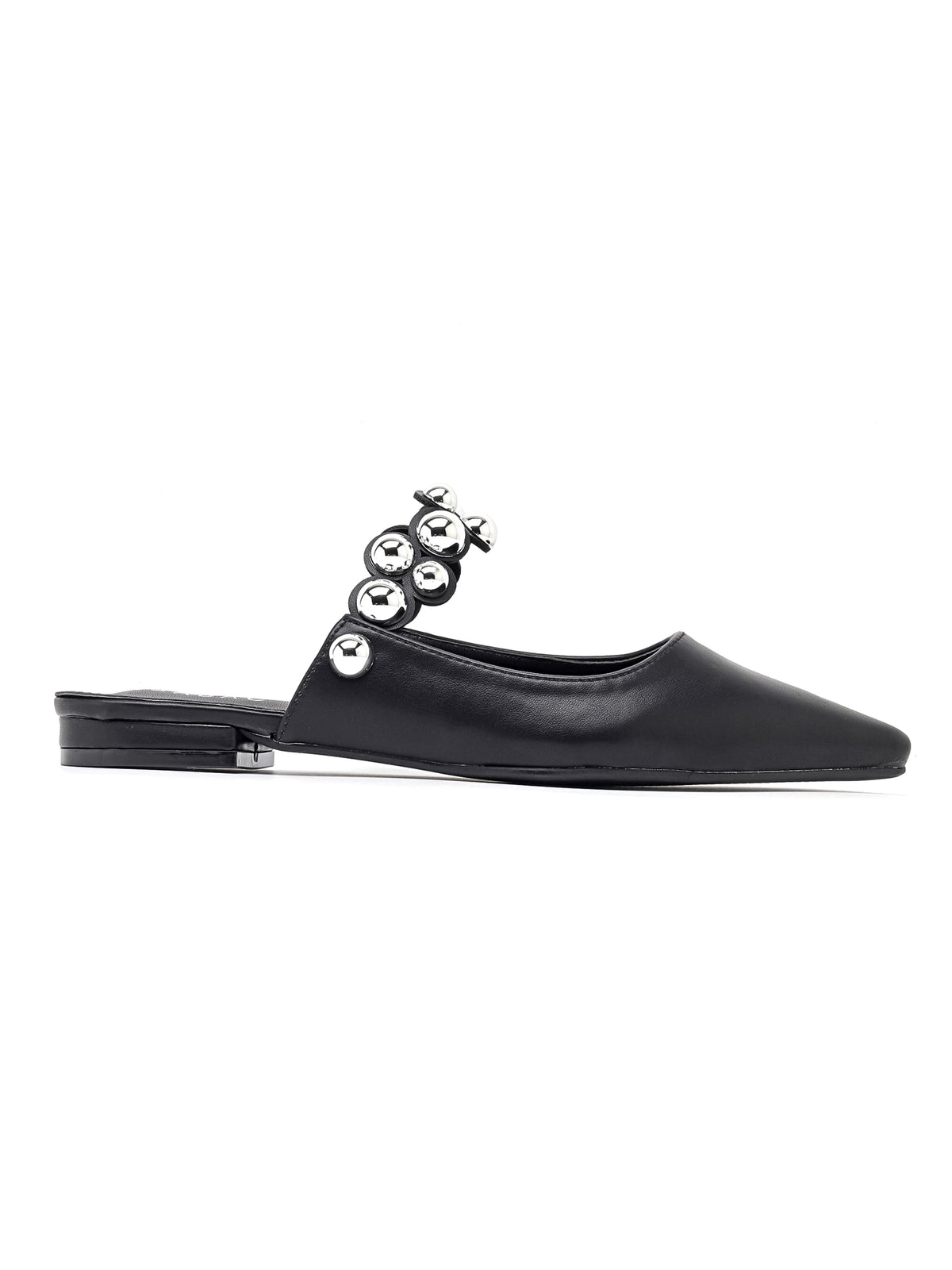 Mule piatto in ecopelle, caratterizzato da una fascia decorativa impreziosita da sfere metalliche.