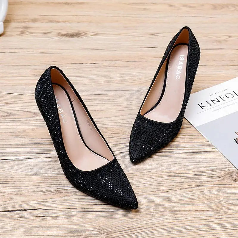 ISABAC décolleté con tacco alto, realizzato con materiale satin decorato con strass.
