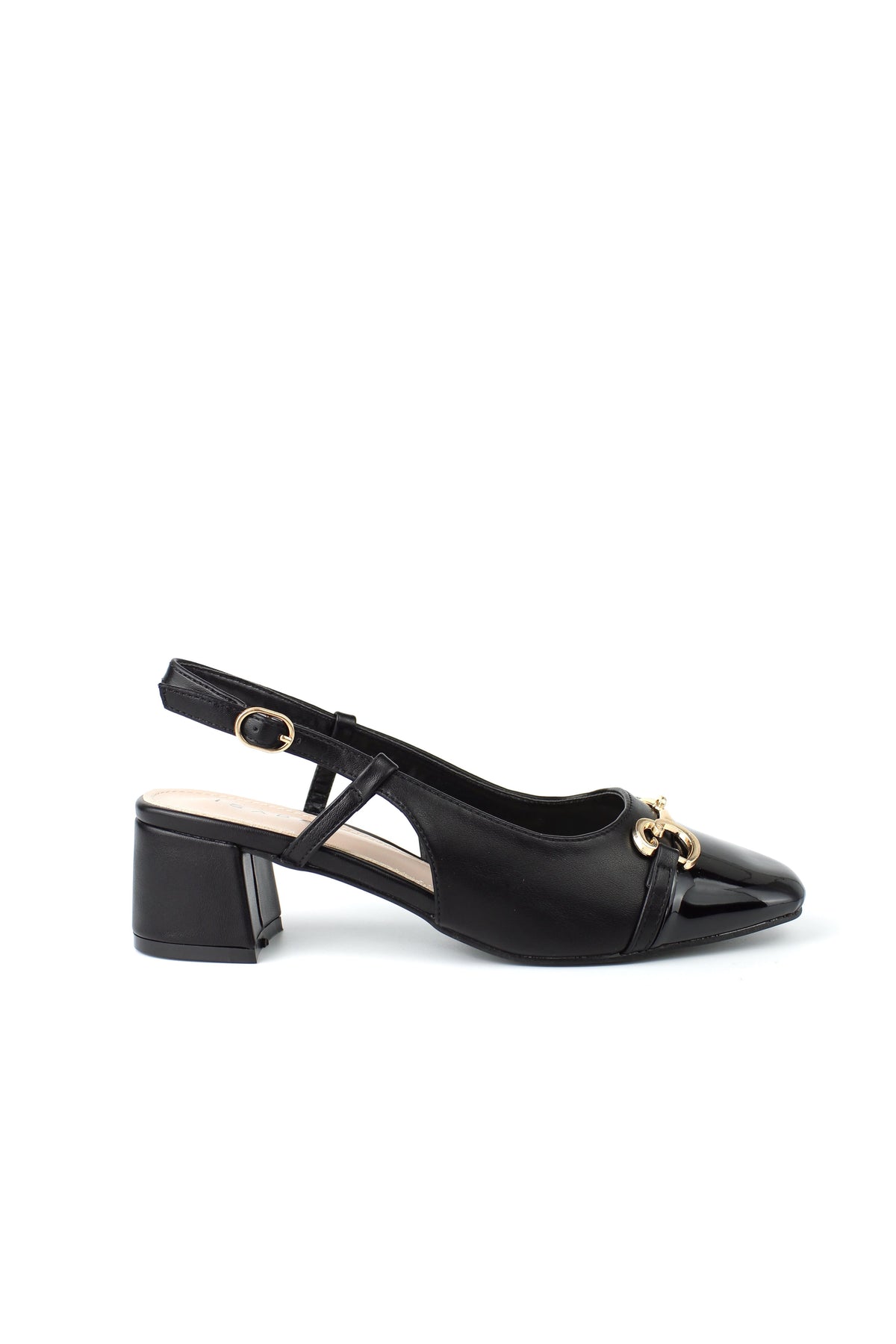 Slingback in ecopelle, tacco largo, dettaglio fibbia dorata e ecopelle in vernice sulla punta della tomaia.