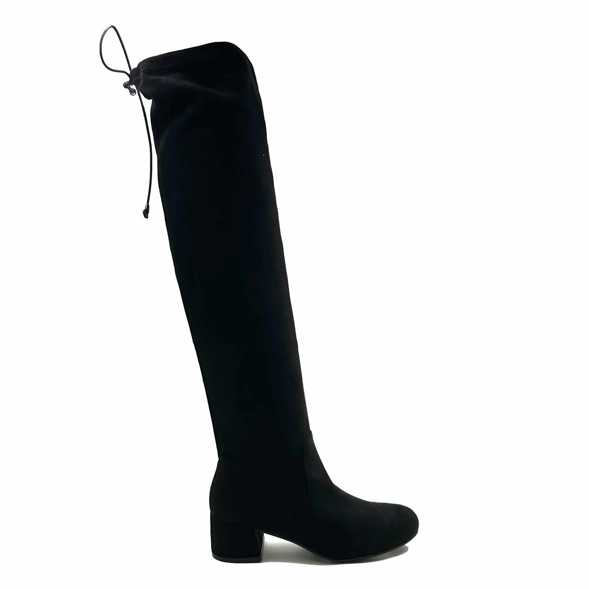 Stivale ISABAC nero al ginocchio con tacco largo. Realizzato in tessuto, presenta un pratico laccio regolabile per una vestibilità personalizzata.
