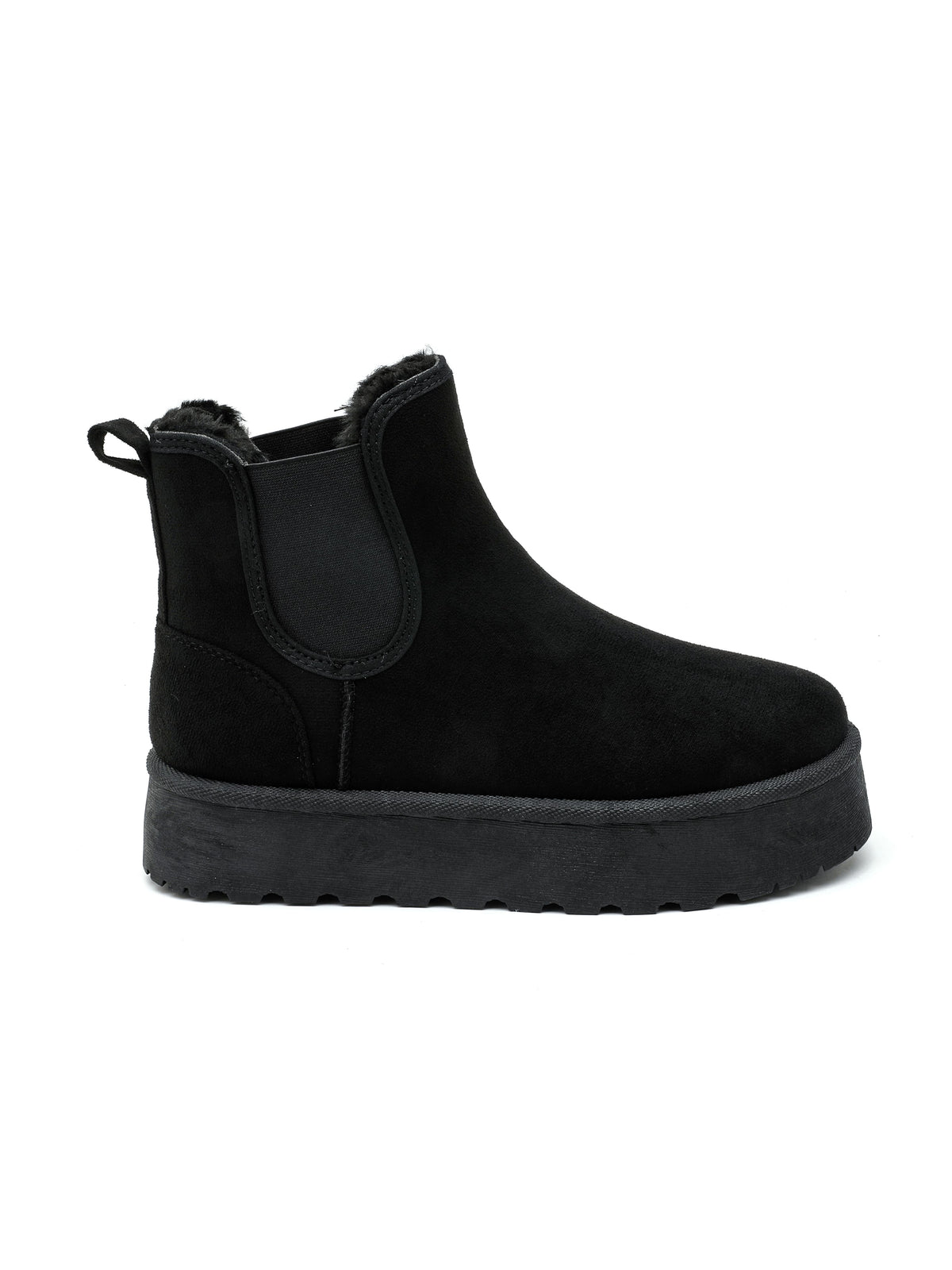 Stivaletto in tessuto scamosciato, inserti elastici laterali, fodera in eco-pelliccia, suola platform.