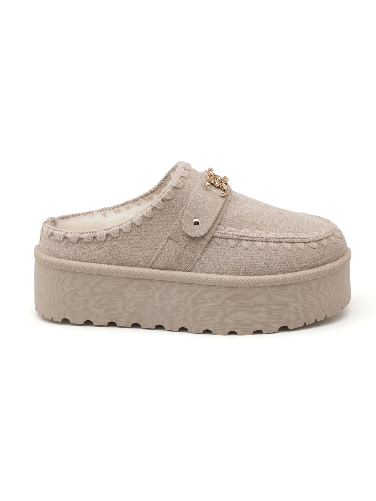 Mule slip-on in tessuto, cuciture bianche, fodera in ecopelliccia, suola platform.