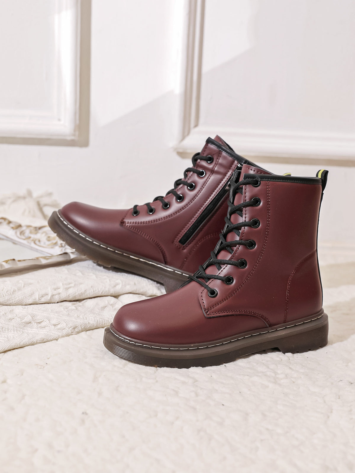 Combat boots anfibi in ecopelle, lacci frontali, suola nera in gomma.