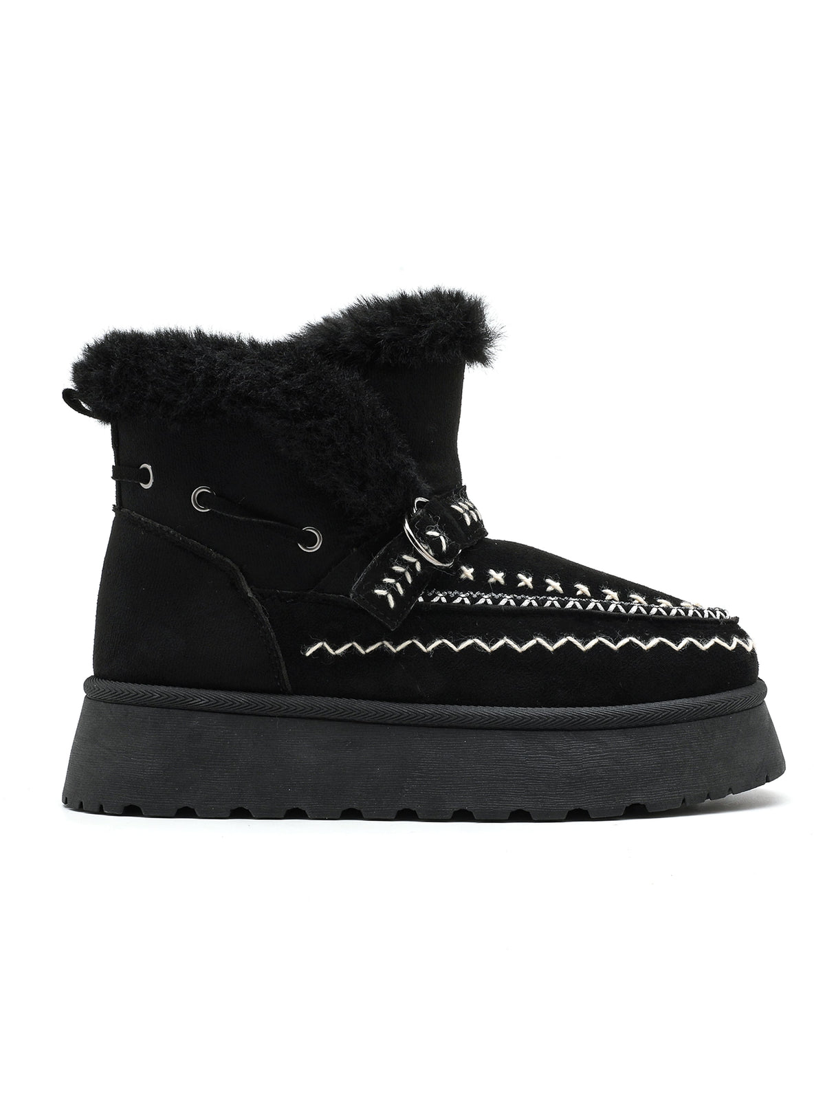 Stivale in tessuto scamosciato, fodera in eco-pelliccia, cuciture a vista e suola platform.