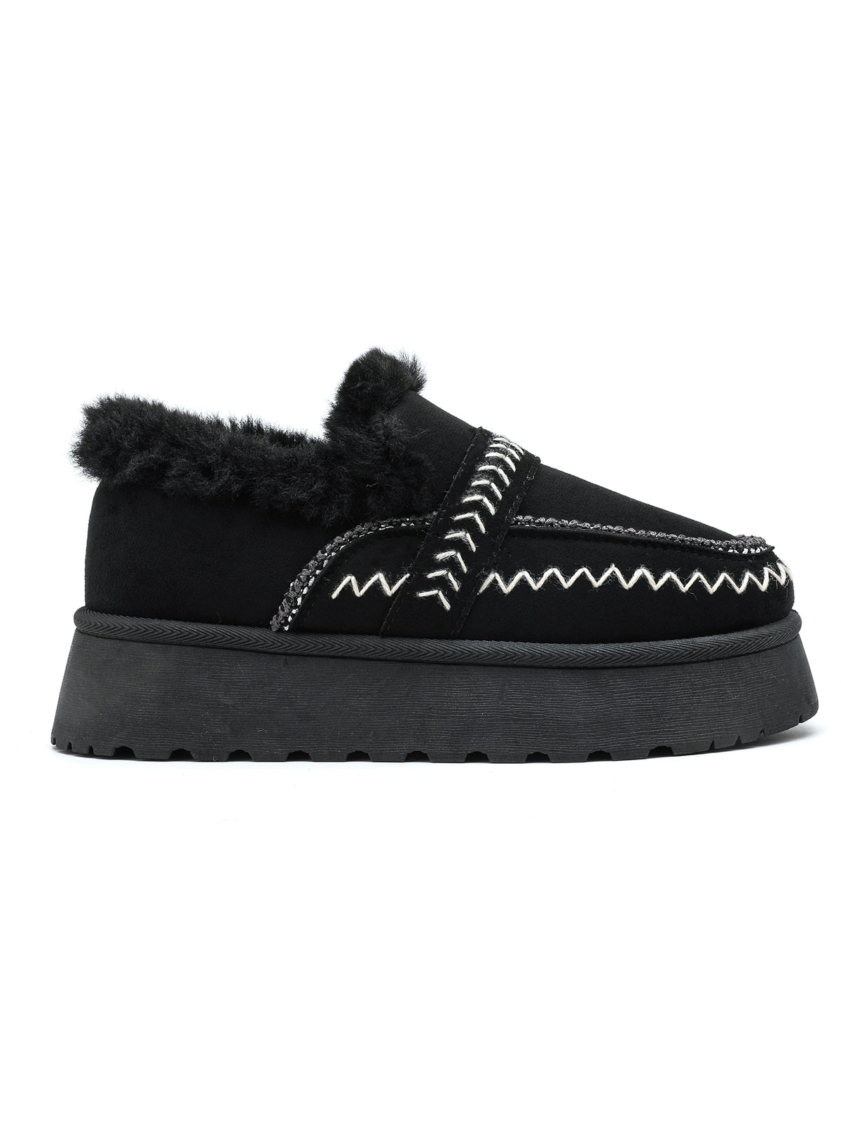 Pantofola platform in tessuto scamosciato, suola platform, fodera in eco-pelliccia e cuciture decorative bianche.