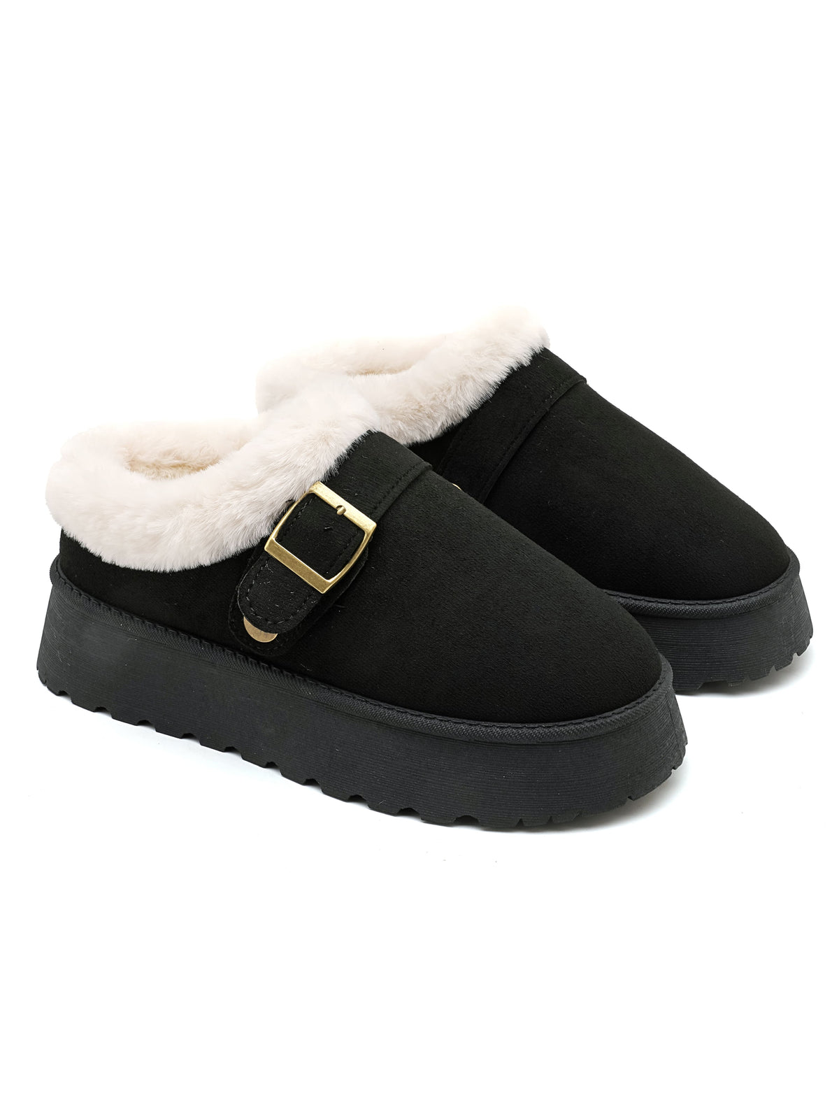 Sabot slip-on in ecopelle scamosciata, fodera in pelliccia vegana, cinturino con fibbia e suola spessa in gomma.