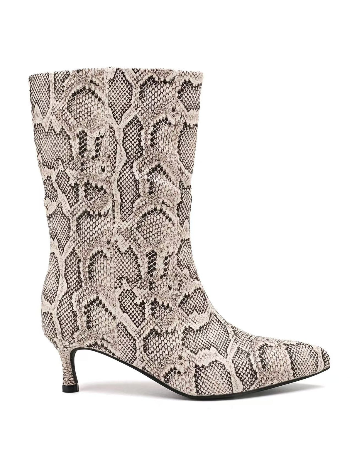 Stivaletto in ecopelle, altezza metà polpaccio, punta affusolata e tacco basso e stretto, stile raffinato.