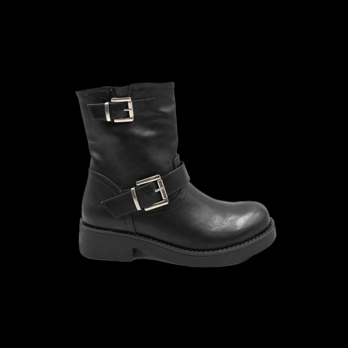 Stivale in pelle vegana liscia con fibbie classiche argentate e tacco medio.