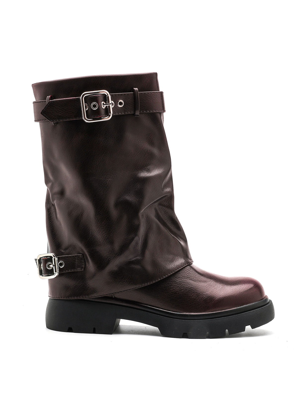Stivale ISABAC in ecopelle bordeaux, doppia fibbia argento, suola robusta nera, e zip laterale.