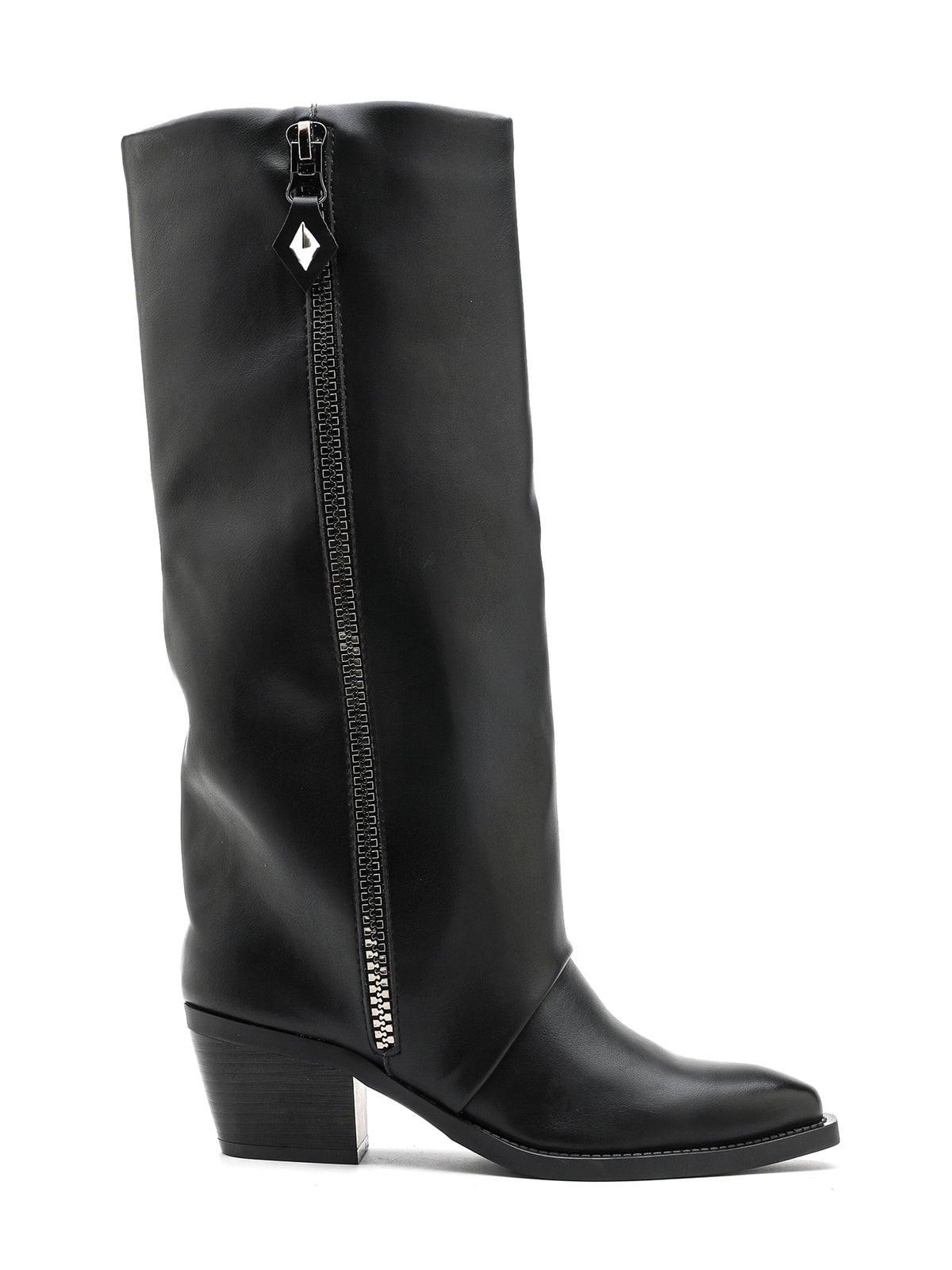 Stivale alto in ecopelle, con cerniera laterale e tacco robusto, stile elegante e deciso.