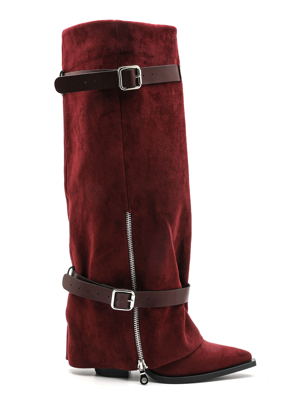 Stivale in ecopelle scamosciata, silhouette slouchy, cinturini e fibbie nere, zip laterale e tacco basso inclinato.