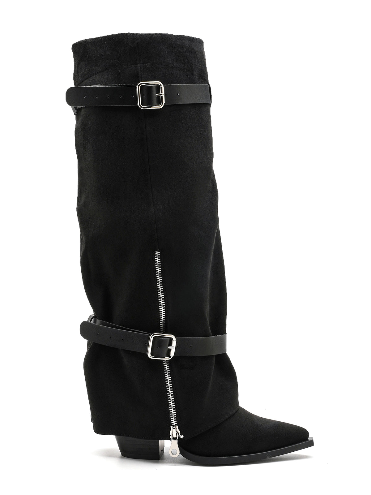 Stivale in ecopelle scamosciata, silhouette slouchy, cinturini e fibbie nere, zip laterale e tacco basso inclinato.