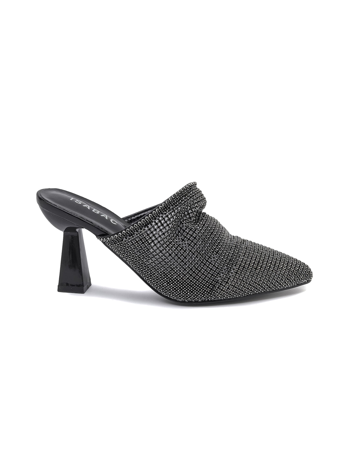 Mules a punta in metallo dorato, adornato da gioielli sull'intera tomaia, con tacco a blocco.