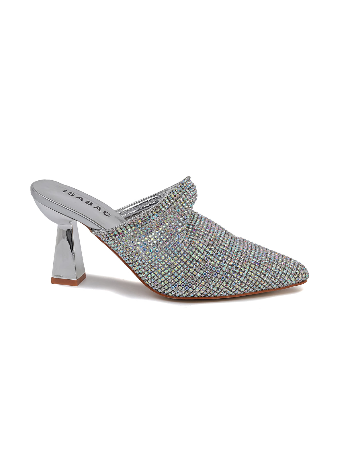 Mules a punta in metallo dorato, adornato da gioielli sull'intera tomaia, con tacco a blocco.